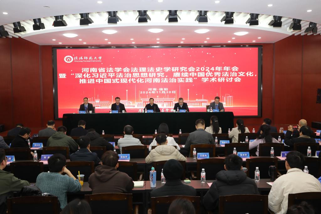 11月30日,河南省法学会法理法史学研究会2024年年会暨 “深化习近平法治思想研究,赓续中国优秀法治文化,推进中国式现代化河南法治实践” 学术研讨会在我校召开。研讨会由河南省法学会法理法史学研究会主办,我校法学与社会学学院(知识产权学院)、大别山乡村振兴研究院承办。校党委副书记、工会主席岳宗德,北京大学博士生导师李启成,河南省法学会法理法史学研究会会长王建国、秘书长李建新,我校法学与社会学学院党委书记尚红林等出席开幕式。来自全省各高校和法律实务部门的法理法史学界专家学者以及研究生100余人参加。