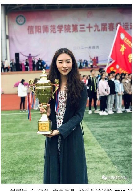 刘雨婧,女,汉族,中共党员,教育科学学院2018级学前教育专业学生,现任教育科学学院学生会执行主席,2018级学前教育本科一班班长,被评为信阳师范学院学院三好学生、模范干部,荣获国家励志奖学金、校级一等奖学金,在信阳师范学院第三十八、三十九届运动会中连续荣获女子甲组100米、跳高单项决赛第一名、女子甲组8×200米接力、4×100米接力第一名。其中,4×100米接力赛连续两次打破校纪录。