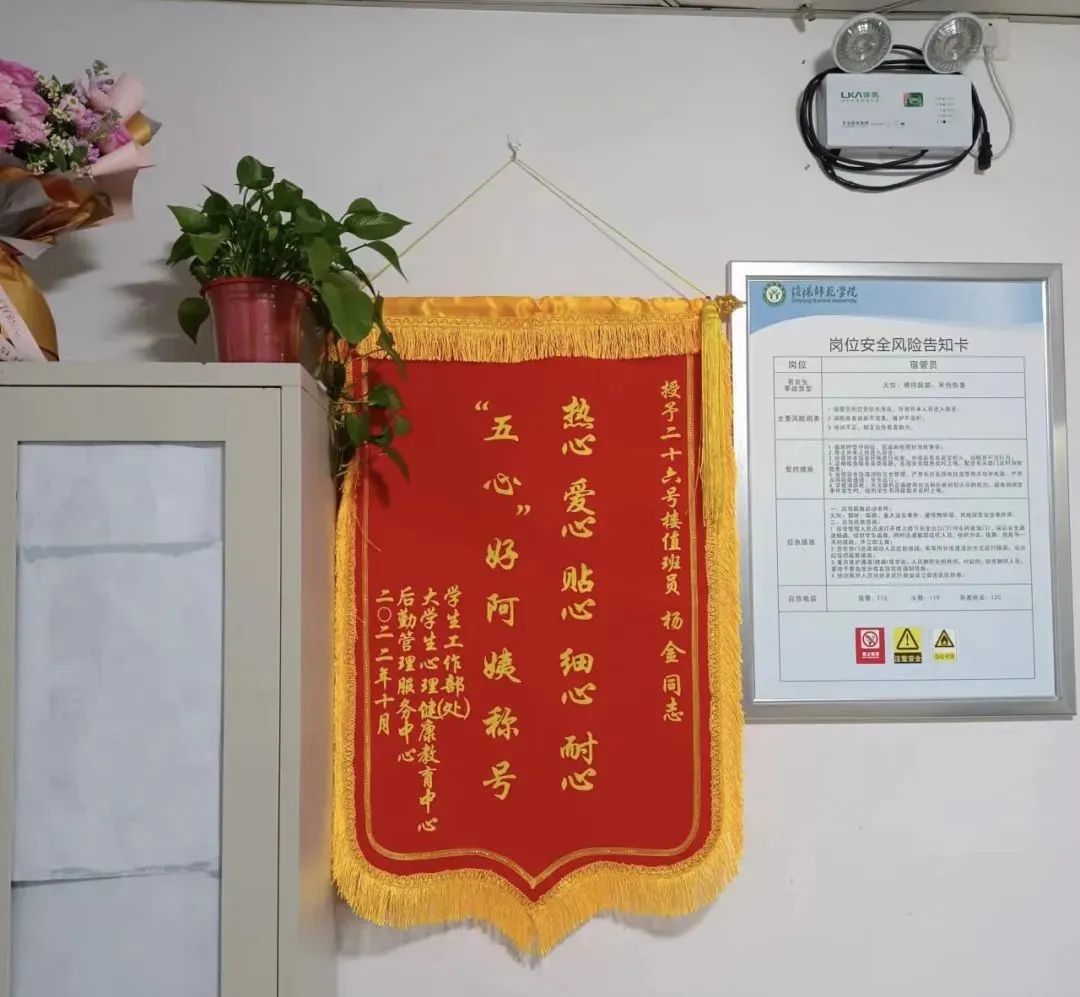 理论优秀和管理优秀让杨金的服务得到了领导和同学们的一致认可。近日,学生处、大学生心里健康中心和后勤服务中心联合授予杨金“五心”好阿姨荣誉称号。热心、爱心、贴心、细心、耐心,是她在职工作态度的生动诠释,也是她在平凡岗位的责任担当。熟知杨金的好多同学们都亲切地称呼杨金“妈妈”,她无微不至的关怀让身处异乡的同学们感受到了母亲般的温暖、朋友般的体贴。杨金的服务大到开学之际为每个宿舍宣传安全问题,下雨天把全楼晾晒的衣服被子收拾起来,假期给宿舍开窗通风,配合辅导员给同学们寄快递;小到帮同学拔电车钥匙,给宿舍内同学养的花草植物浇水,把关学生的私人感情生活,倾听学生分享的幸福与苦恼。