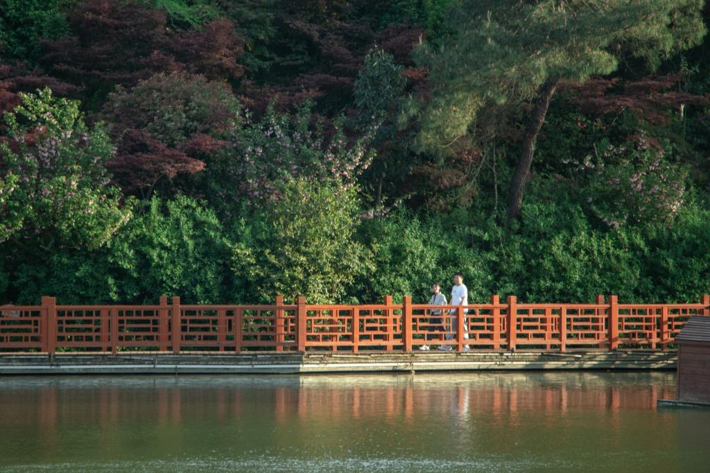 不知过了多久,睁开眼睛,已是傍晚,圆圆的太阳像是刚从冰箱中拿出来的鸭蛋黄,褪去了刺眼的光芒,变得分外柔和,橙黄的边缘镶嵌着明亮的赤金,在西边的天空中颤颤悠悠地挂着,这是一天中最盛大的景致。就像蘸满了各色颜料的画笔,在青白的天色里尽情挥洒。一时间落日烙金、云蒸霞蔚,深红与明黄相互晕染,灿金与浅紫交错相织,山下的半亩塘澄明透亮,像一面明镜,映出墨绿色的倩影。微风吹过,水面的余晖便被搅乱成一池碎金。夜至,花香悄然隐匿,凉风轻触面庞,远处的山脉在深蓝的天空下蜿蜒起伏,向着远处舒展开来,也抚平了我的心情,晚风和路灯下花树的光影相互交错,别有一番韵味,疏影横斜花摇曳……
