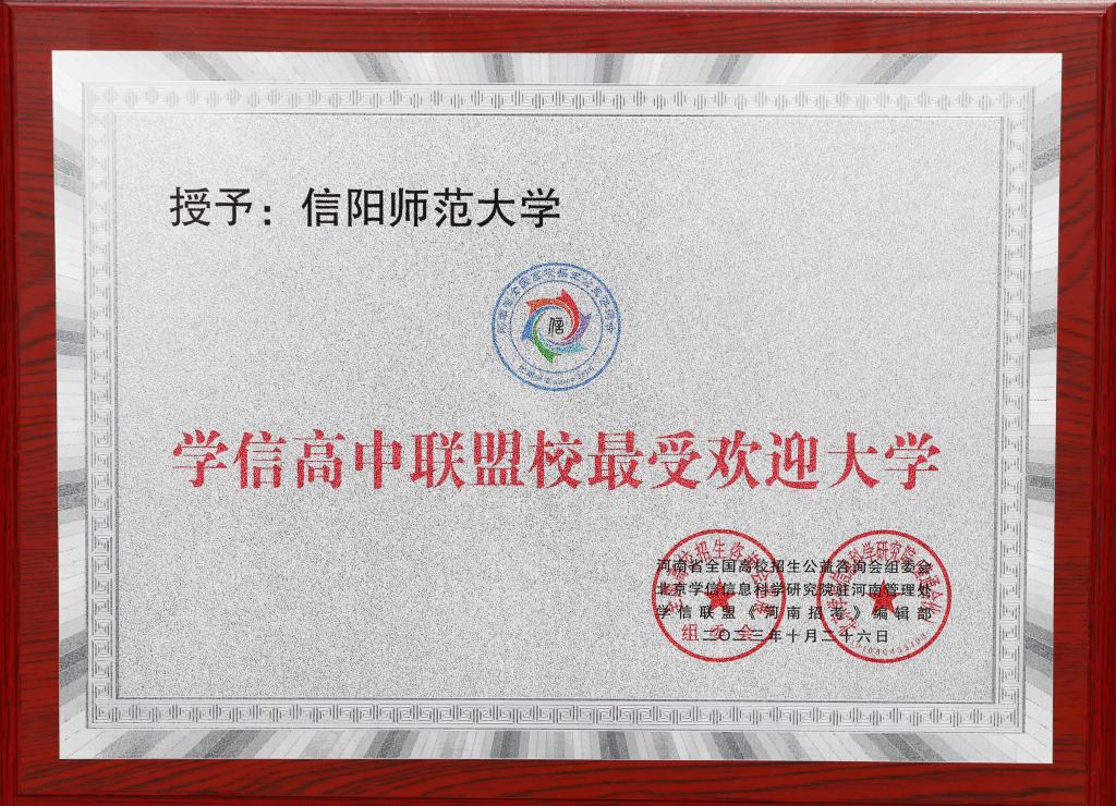 近日,河南省全国普通高校招生咨询会巡展组委会和学信(高中)联盟校共同举办2023年全国高校招生宣传总结会议,我校荣获“学信高中联盟校最受欢迎大学”称号。